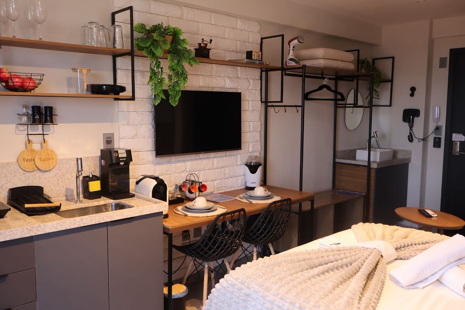 Os hóspedes terão acesso completo a todas as dependências do apartamento, incluindo a área privativa com cozinha compacta, banheiro, sala de estar e quarto. Além disso, poderão utilizar as áreas comuns do condomínio, como a piscina e a academia, durante o horário de funcionamento.